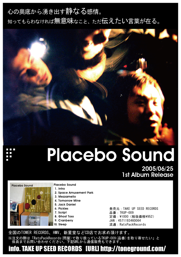 Vo.細谷俊晴 Gu.竹澤 亮 Ba.佐竹由行 Dr.マット ソーレン 2002年12月、高校の同級生だったボーカルのトシとギターのリョウがバンドを結成するべく、仙台でメンバー探しを兼ねて、ストリートライブをしていた所に、偶然通りかかったドラムのマットが声を掛けて来て意気投合し3人で活動を始める。その直後に楽器屋のメンバー募集で知り合ったベースのヨシを加えて、2003年1月バンド名を「プラシーボサウンド」とし、独創的な音楽を作ることを目標とし活動を開始する。その年の5月にリプルで初LIVEをし、その後、主に仙台のHookやPARK SQUAREなどのライブハウスを中心にライブ活動をする。 |