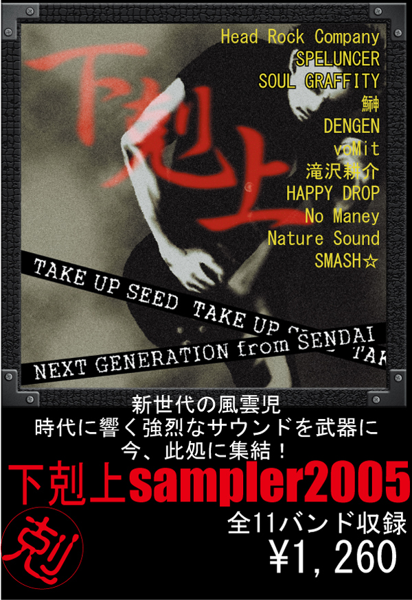次世代を担う在仙若手バンドが集結する下剋上サミット2005年は今後のシーンの鍵を握る超強力な顔ぶれが揃いました!平均年齢20歳という若さ、ROCK・POP・HARDCORE・MIXTURE・PUNK・MELODIC・HEAVYROCK・ACOSTICなど幅広いジャンルの総勢12バンド、まさに若手を代表するに相応しい役者が一堂に会する2日連続のライブイベントを開催!新時代の音楽を仙台から発信していく壮大なプロジェクトとなっているこの下剋上サミット2005では、なんと参加バンドの音源を収録した「下剋上sampler」を全国リリース!さらにイベントに2日間とも来場した人には一足早くCDをプレゼントしてしまうという豪華な特典付!新しいムーヴメントの担い手となる若い力が集結するこのイベントが、仙台に大きな嵐を巻き起こすことは間違いありません!