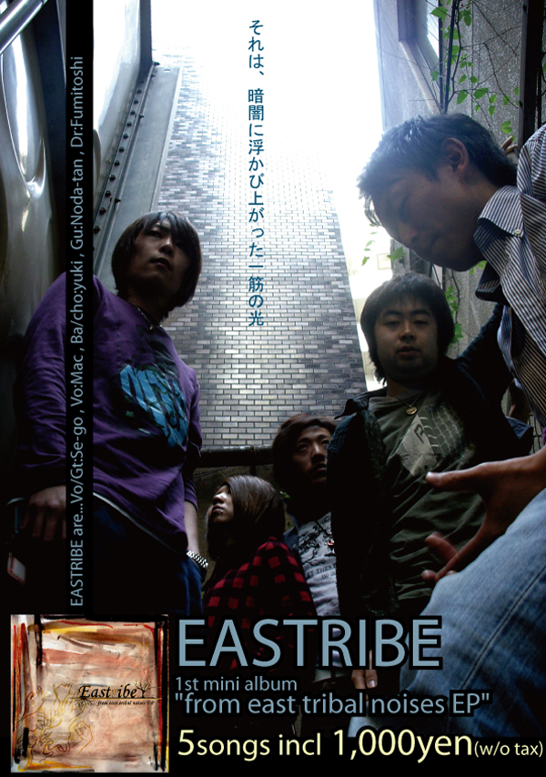 Vo:Mac Vo/Gt:Se-go Gt:Noda-tan Ba:Yuki Dr:YxSxK(surport) 2003年大学のサークルで2MC+DJを取り入れた前身バンド結成。数回のライブの後メンバーを大幅に入れ換え「EASTRIBE」として活動開始。2004年10月に仙台のインディーレーベルTAKE UP SEED RECORDS主宰オムニバスCD「下剋上2004」に参加。メンバーそれぞれ複数のバンドに所属し(Gt→Nature Sound、Vo/Gt→Brave、Ba→pinfall、Vo→Blue Salersなど)その斬新なプレイスタイルに多方面から支持を集める。2005年ドラマー脱退により現サポートメンバーMatsumoto(voMit)を加え、ヘヴィなグルーヴと2MCのコントラスト、そして普遍的なポップセンスに裏づけされたソングライティングを武器に活動を展開。特に10代の若い世代から 絶大な人気を誇るとともに、ala、he、GO-POSTALなどツアーバンドのサポートアクトも務め着実にレベルアップを重ねている。2006年1月に音源発売イベントを仙台CLUB JUNK BOXで開催、その後Voの脱退と共にSe-go加入、サポートドラマーにYxSxKを迎え現在の編成に。今後活動のフィールドを仙台から東北、そして全国へと展開していこうとしている。 |