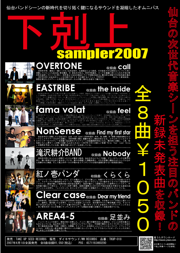 飽和状態にある音楽シーン、新しいムーヴメントを創造するには既存の概念に縛られない若い世代のエネルギーが必要だ!その信念に基づき、2007年ブレイク必至の要注目アーティストをピックアップし、今年の仙台のバンドシーンの核となる大きな流れを自分たちの手で創り出そうという「下剋上」様々な形で新時代を切り拓く一大プロジェクトの一角を担う全国発売音源がこの下剋上sampler2007なのです。