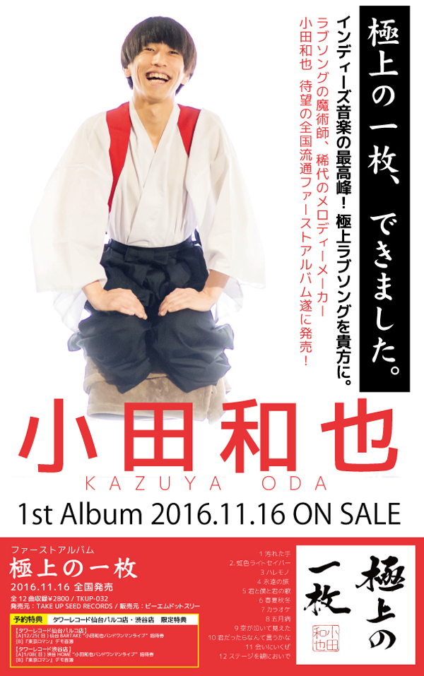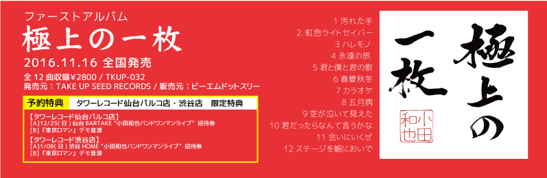 | 小田和也 「極上の一枚」 2016年11月16日発売 TAKE UP SEED RECORDS / TKUP-032 / ¥2800 収録曲: 1. 汚れた手 2.