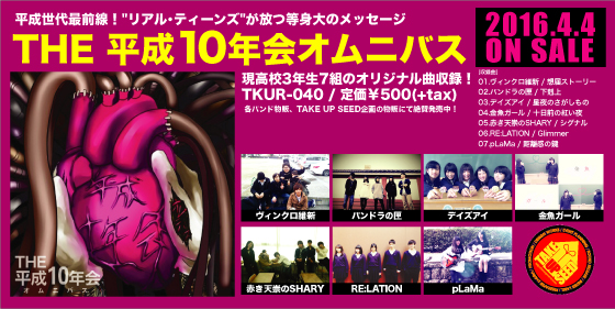 THE 平成10年会オムニバス 2016年4月4日発売 TAKE UP SEED RECORDS / TKUR-040 / ¥500 収録アーティスト: 01.ヴィンクロ維新 02.パンドラの匣 03.デイズアイ 04.金魚ガール 05.赤き天崇のSHARY 06.RE:LATION 07.pLaMa |