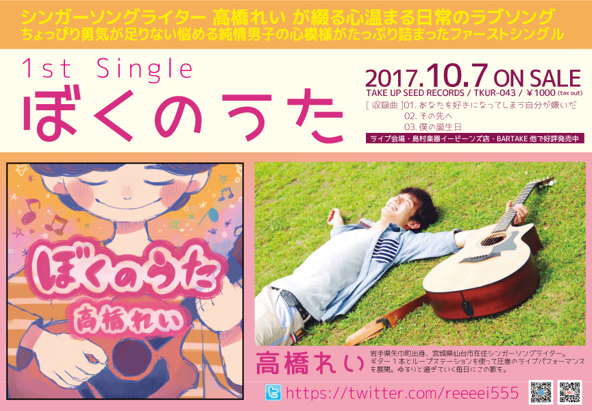 高橋れい 1st Single "ぼくのうた" 2017.10.7 発売 ¥1000 / TKUR-043 01.あなたを好きになってしまう自分が嫌いだ 02.その先へ 03.僕の誕生日 |