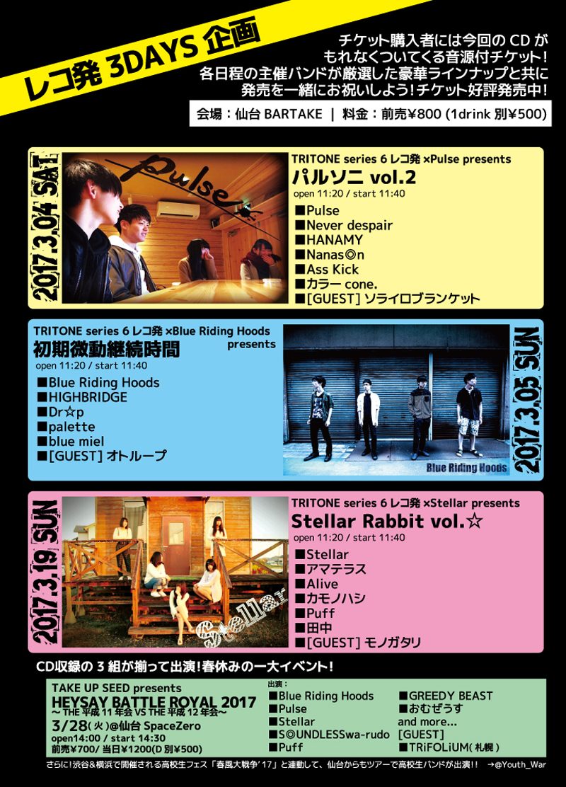 女性ボーカル3バンドのオリジナル曲を収録した3way split CDがシリーズ4に引き続き発売!![]() >>詳細ページ |